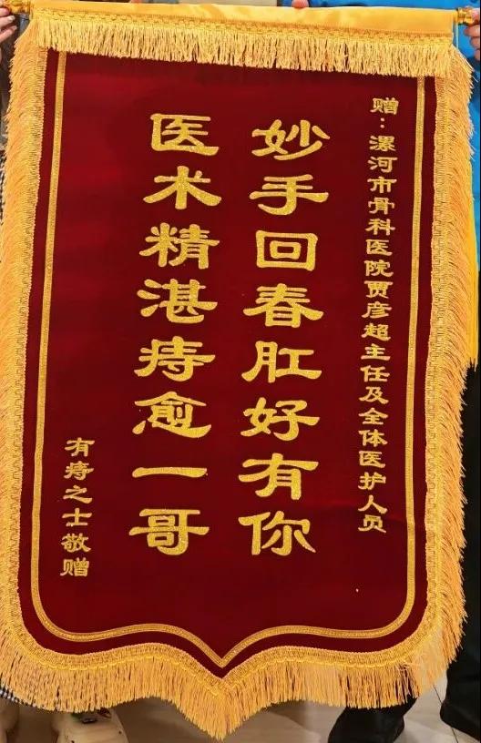 近日,漯河醫(yī)專二附院(漯河市骨科醫(yī)院、漯河市立醫(yī)院)肛腸科收到一面滿載心意的錦旗?;颊呶罩Z彥超主任的手再三致謝,錦旗上“妙手回春肛好有你,醫(yī)術(shù)精湛痔愈一哥”十六個大字,既是對醫(yī)護人員專業(yè)能力的肯定,更是對肛腸科中西醫(yī)結(jié)合診療水平的認可。