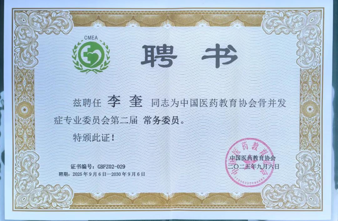漯河醫(yī)專二附院名譽院長李奎教授獲聘中國醫(yī)藥教育協(xié)會骨并發(fā)癥專業(yè)委員會常務委員