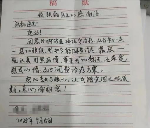 就這樣,在專業(yè)治療與耐心陪伴下,患者的腳踝一天天好轉(zhuǎn):從最初只能緩慢行走,到后來能正常上下樓梯,再到如今可以輕松散步——曾經(jīng)讓患者困擾不已的“老大難”問題,終于徹底解決。出院那天,患者特意手寫了這封感謝信,字里行間滿是真誠(chéng):“張醫(yī)生不僅治好了我的疼痛,更撫平了我心里的焦慮,這樣的好醫(yī)生,值得我們真心感謝!”