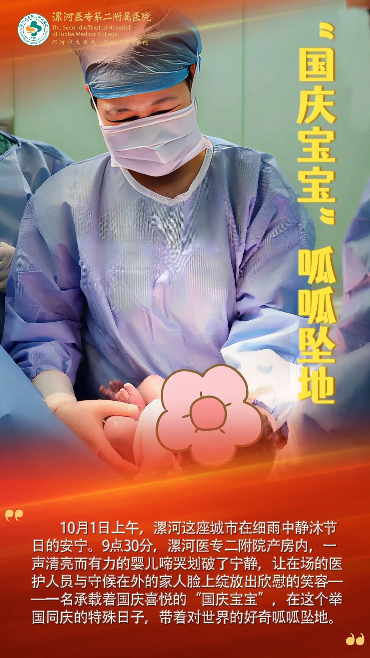 10月1日上午,漯河這座城市在細(xì)雨中靜沐節(jié)日的安寧。9點(diǎn)30分,漯河醫(yī)專二附院產(chǎn)房內(nèi),一聲清亮而有力的嬰兒啼哭劃破了寧靜,讓在場(chǎng)的醫(yī)護(hù)人員與守候在外的家人臉上綻放出欣慰的笑容——一名承載著國慶喜悅的“國慶寶寶”,在這個(gè)舉國同慶的特殊日子,帶著對(duì)世界的好奇呱呱墜地。