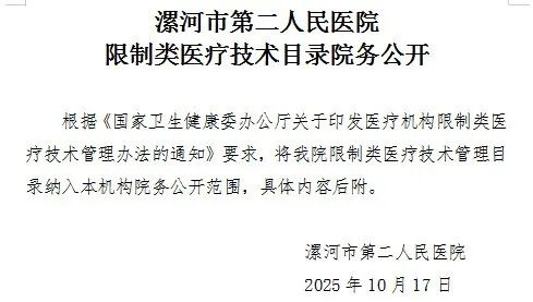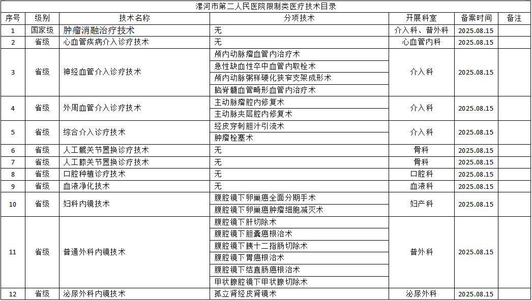 【公示】漯河市第二人民醫(yī)院限制類醫(yī)療技術(shù)目錄院務(wù)公開