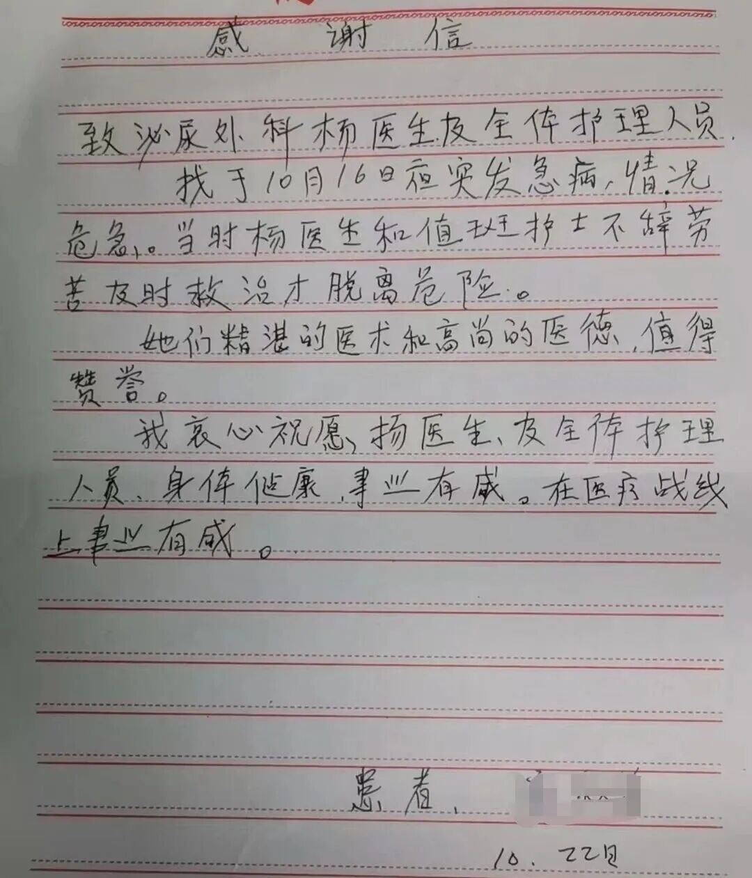為感謝楊艷霞醫(yī)生的及時(shí)救治和護(hù)士們的貼心照顧,出院后患者特意寫(xiě)下一封感謝信,字里行間滿是對(duì)楊醫(yī)生專業(yè)醫(yī)術(shù)、敬業(yè)精神和人文關(guān)懷的由衷贊譽(yù),也表達(dá)了對(duì)醫(yī)院泌尿外科醫(yī)療服務(wù)的高度認(rèn)可。