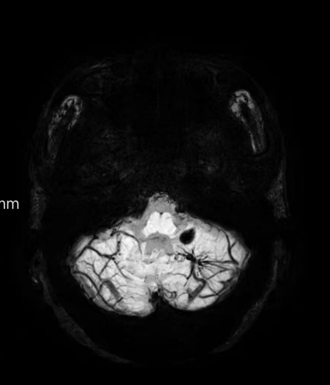 我們大腦里密密麻麻的靜脈血管,在常規(guī)影像上是“灰蒙蒙”的一片。但SWI對脫氧血液極其敏感,能將靜脈血管清晰地顯示為黑色的細(xì)線。這個本領(lǐng)非常有用: