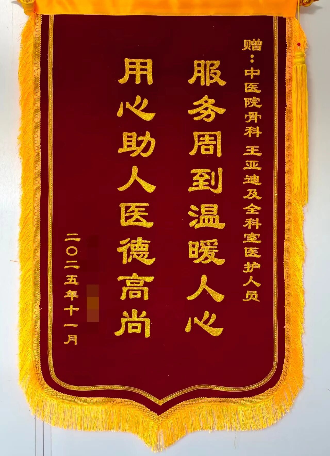 “你們不僅醫(yī)術(shù)高超,還特別有耐心,讓我感受到了家人般的溫暖。” 送錦旗時,黃女士反復(fù)說著感謝。面對贊譽(yù),主管醫(yī)生王亞迪笑著回應(yīng):“這是我們醫(yī)務(wù)人員應(yīng)該做的,看到患者康復(fù),就是我們最大的心愿。” 一面錦旗,不僅是患者對醫(yī)護(hù)團(tuán)隊(duì)的認(rèn)可,更是醫(yī)患之間濃濃真情的見證。(骨 科 王亞迪)