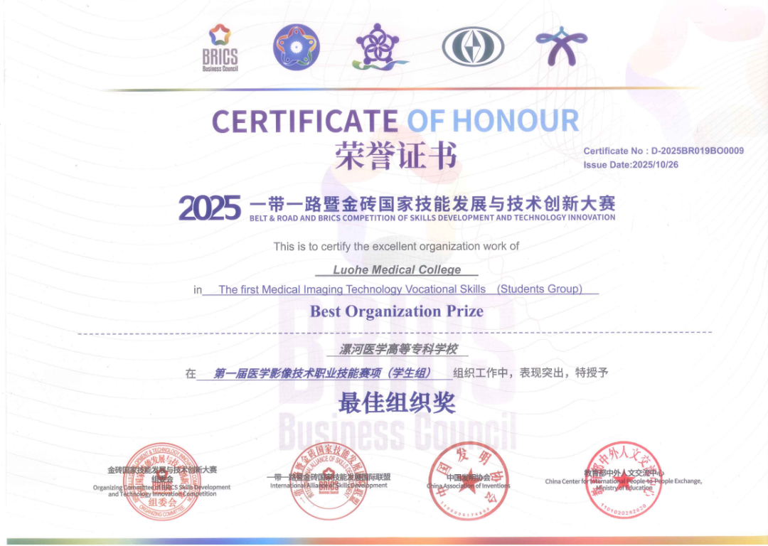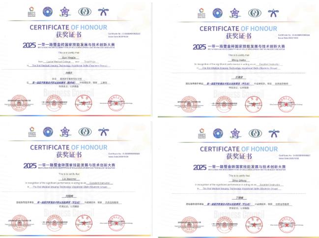 10月23日至26日,2025“一帶一路”暨金磚國家技能發(fā)展與技術(shù)創(chuàng)新大賽——醫(yī)學(xué)影像技術(shù)職業(yè)技能賽項(xiàng)在北京衛(wèi)生職業(yè)學(xué)院舉行。醫(yī)學(xué)影像團(tuán)隊(duì)在周山主任帶領(lǐng)下,與來自全國61所職業(yè)院校的優(yōu)秀師生同場競技,師生團(tuán)隊(duì)奮勇爭先、發(fā)揮出色,在所有學(xué)生實(shí)踐技能比賽及教師教學(xué)比賽中均獲優(yōu)異獎項(xiàng)。