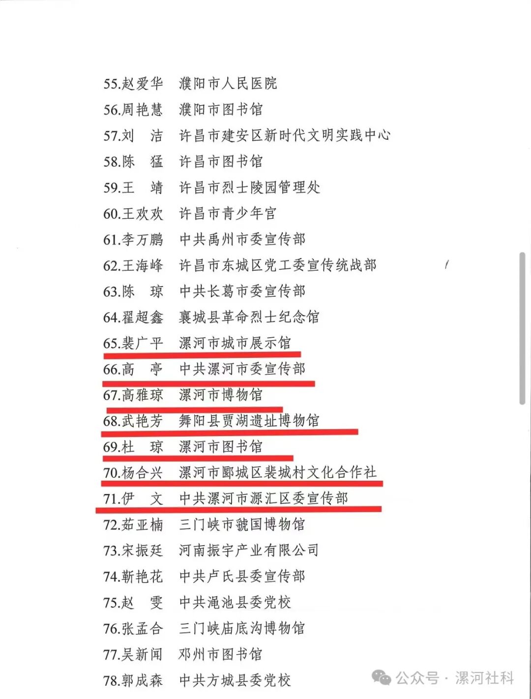2024年社科普及志愿服務(wù)活動(dòng)表現(xiàn)突出社科普及指導(dǎo)員(7名):裴廣平(漯河市城市展示館);高亭(中共漯河市委宣傳部);高雅瓊(漯河市博物館);武艷芳(舞陽縣賈湖遺址博物館);杜瓊(漯河市圖書館);楊合興(漯河市郾城區(qū)裴城村文化合作社);伊文(中共漯河市源匯區(qū)委宣傳部)