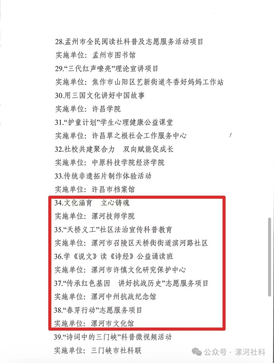 2024年表現(xiàn)突出社科普及志愿服務(wù)活動(dòng)項(xiàng)目(5個(gè)):文化涵育 立心鑄魂(實(shí)施單位:漯河技師學(xué)院);“天橋義工”社區(qū)法治宣傳科普教育(實(shí)施單位:漯河市召陵區(qū)天橋街街道濱河路社區(qū));學(xué)《說文》讀《詩(shī)經(jīng)》公益誦讀班(實(shí)施單位:漯河市許慎文化研究保護(hù)中心);“傳承紅色基因 講好抗戰(zhàn)歷史”志愿服務(wù)項(xiàng)目(實(shí)施單位:漯河中州抗戰(zhàn)紀(jì)念館);“春芽行動(dòng)”志愿服務(wù)項(xiàng)目(實(shí)施單位:漯河市文化館)