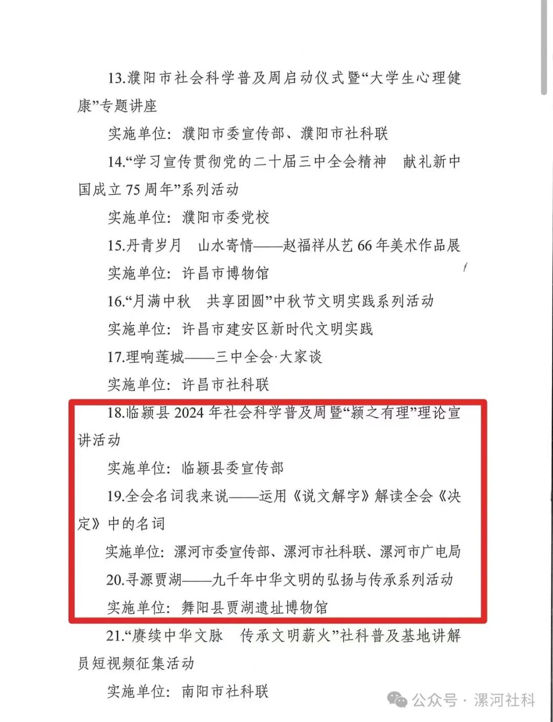 2024年河南省社科普及周活動(dòng)表現(xiàn)突出特色活動(dòng)(3個(gè)):臨潁縣2024年社會(huì)科學(xué)普及周暨“潁之有理”理論宣講活動(dòng)(實(shí)施單位:臨潁縣委宣傳部);全會(huì)名詞我來說——運(yùn)用《說文解字》解讀全會(huì)《決定》中的名詞(實(shí)施單位:漯河市委宣傳部、漯河市社科聯(lián)、漯河市廣電局);尋源賈湖——九千年中華文明的弘揚(yáng)與傳承系列活動(dòng)(實(shí)施單位:舞陽縣賈湖遺址博物館)