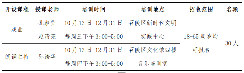 1.報(bào)名時(shí)間為9月15日至9月19日,有意參加培訓(xùn)的人員,請攜帶本人有效身份證復(fù)印件1張、近期2寸照片1張前往召陵區(qū)文化館辦公室(召陵區(qū)汾河路與祥云路交叉口東南角4樓)報(bào)名,電話報(bào)名無效,需本人現(xiàn)場報(bào)名,代替報(bào)名無效,名額有限,報(bào)滿截止;報(bào)名結(jié)束后,報(bào)名人數(shù)不滿70%,則取消該班。培訓(xùn)時(shí)間為10月13日至12月31日。